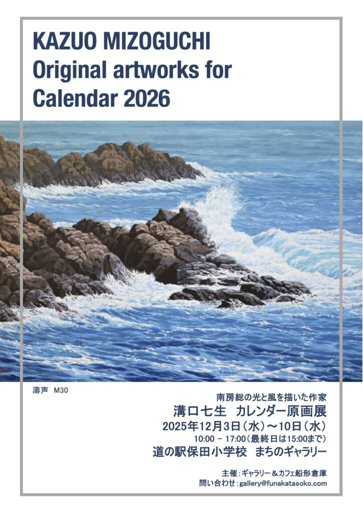 船形倉庫では、毎年溝口七生作品のカレンダーを作成販売していますが、2026年カレンダーの販売に合わせ、鋸南町の道の駅・保田小学校にて原画展を開催します。